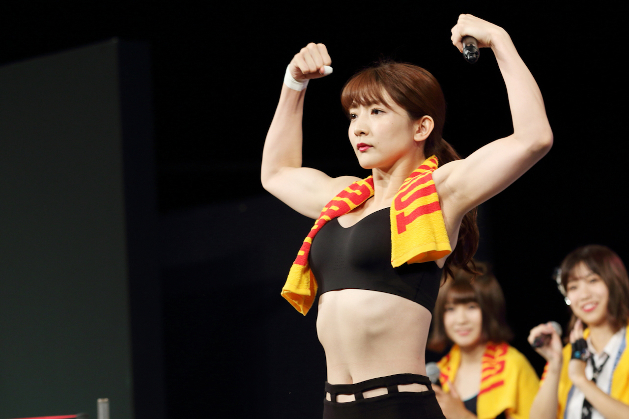 続いて、決勝トーナメントから参加するアップアップガールズ(仮)の森さんが登場。2014年、2015年と連覇を果たしたものの、それ以降は酒井さんと我妻さんに敗れ優勝からは遠のいています。新日本プロレスの人気レスラーであるオカダ・カズチカ選手の肉体改造を指導してきた足立光トレーナーのもとで鍛えた彼女は、打倒“我妻・酒井”を果たせるのか?