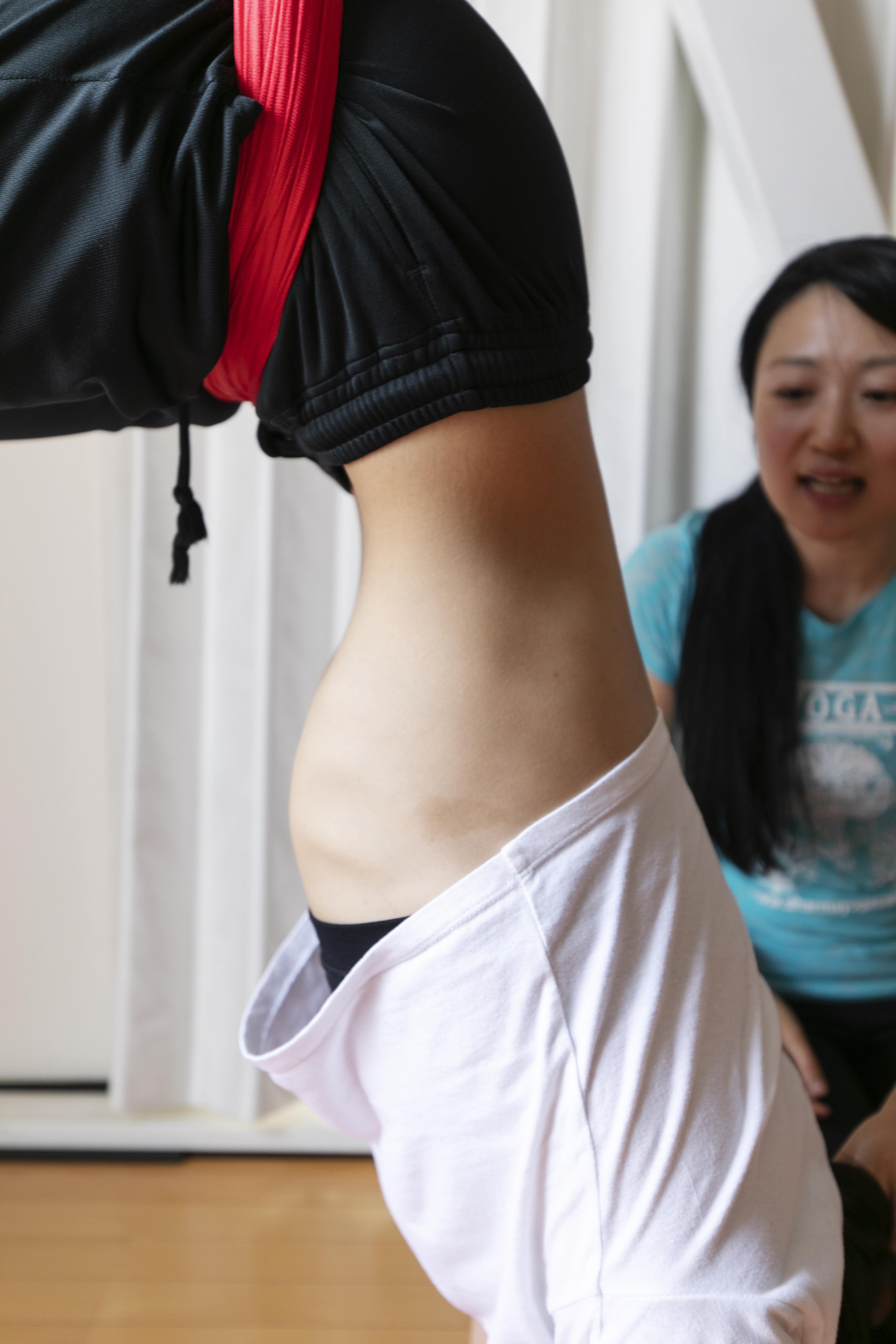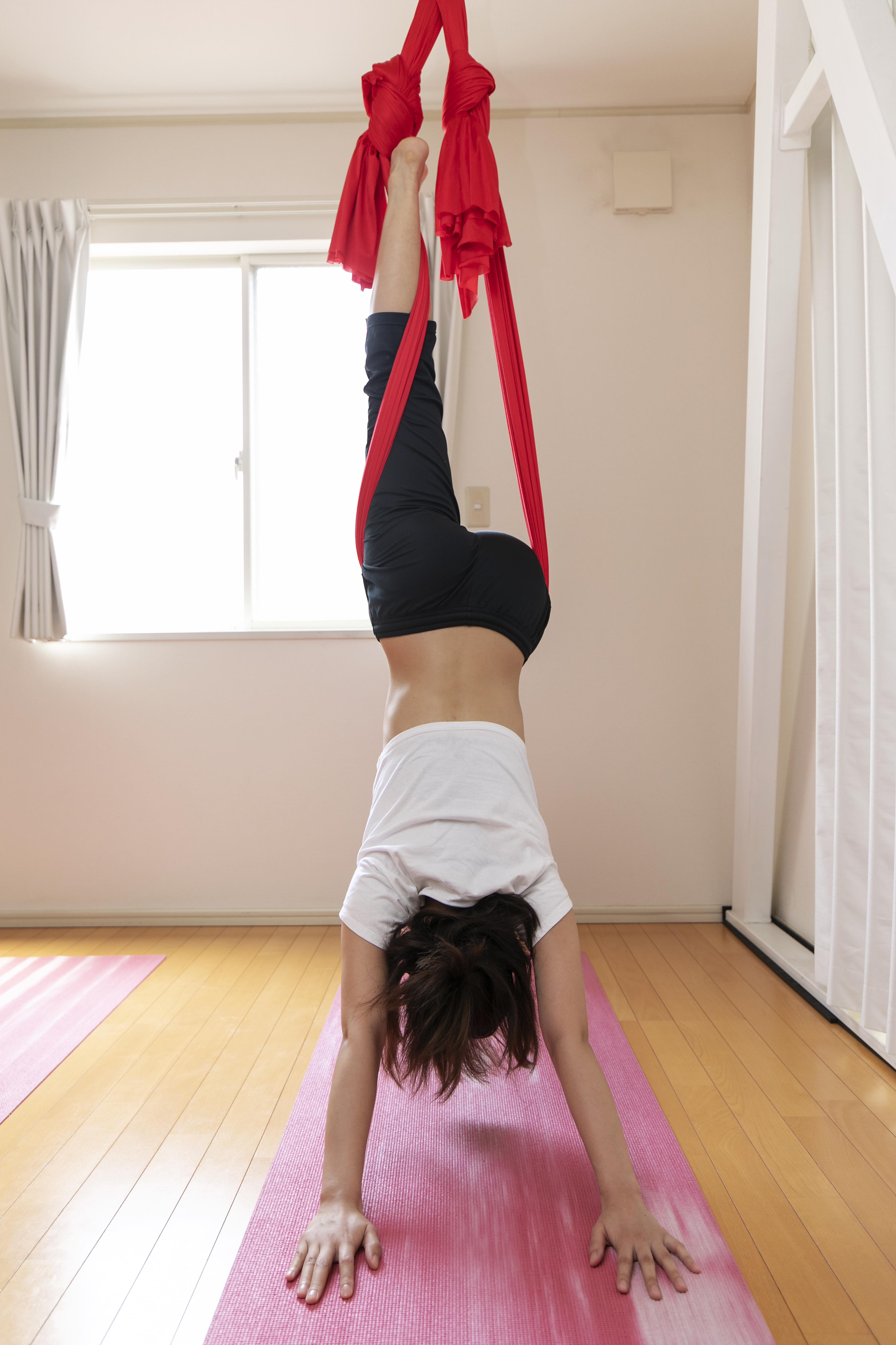 通常のヨガでも自由自在にお腹をへこます呼吸法はありますが、マスターするのは大変。しかし、エアリアルヨガでは逆立ちの状態になることで、受動的にお腹をへこますことができるのです。「これは普通に生きてたらできないですよね(笑)」(岡田さん)。