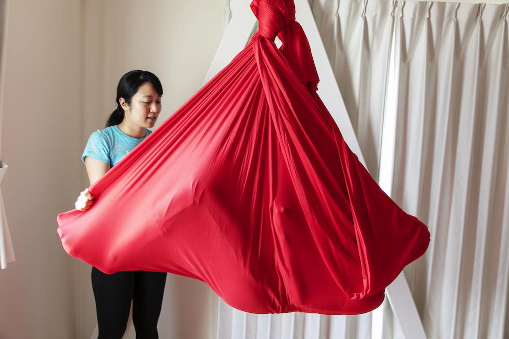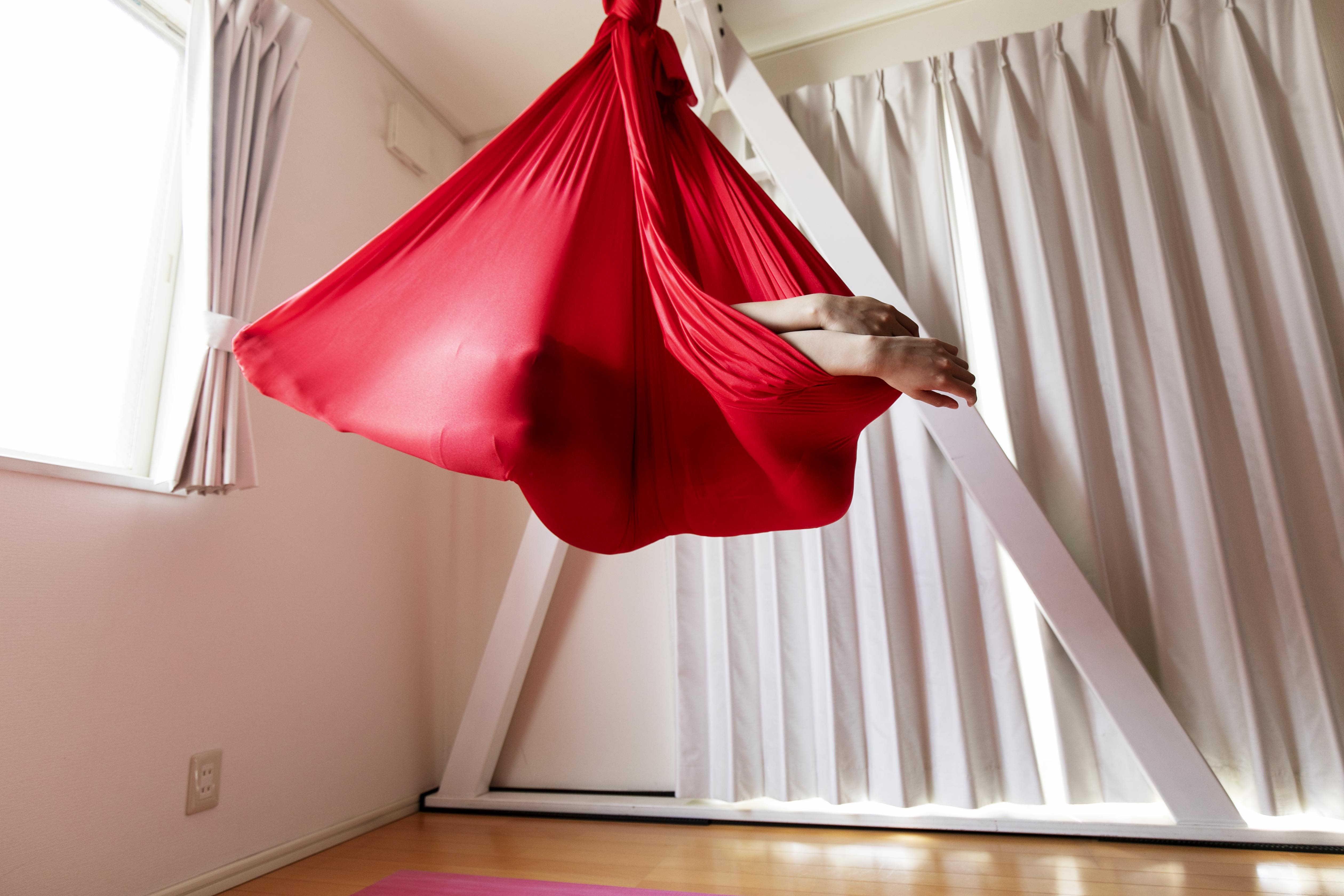 シルクまたはティシューと呼ばれる布にぶら下がって行うエアリアルヨガ(空中ヨガ)。通常のヨガとは違い、重力を利用することでさまざまな体勢ができたり、さらに不安定さを利用し体幹も鍛えられるなど、メリットもあります。