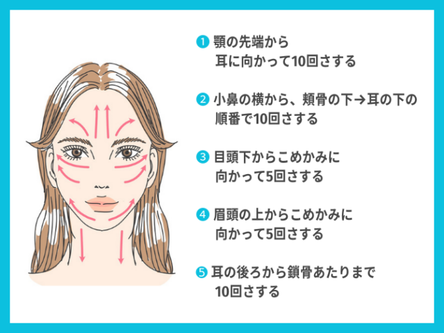 - 小鼻の横から、頬骨の下→耳の下の順番で10回さする