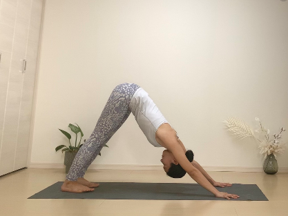 10. 足踏みを止め、お尻をさらに後ろに引き、ダウンドッグポーズで3呼吸キープ。ひざを伸ばすことで腰が丸まる場合は、ひざを軽く曲げてよい。