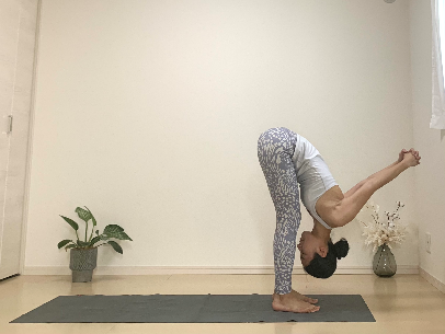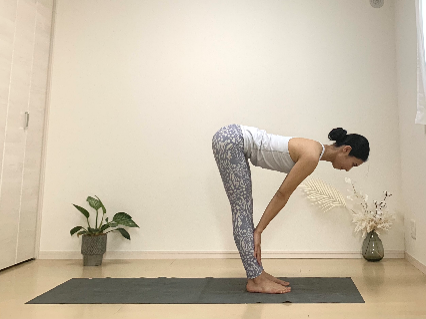 12. 息を吐いて、前屈。両手を背中側に回し、指を組む。首の力は抜いておく。