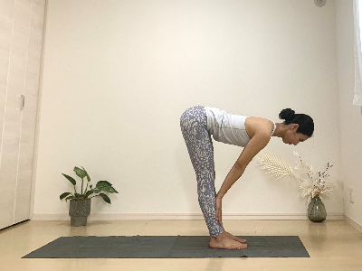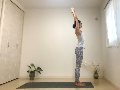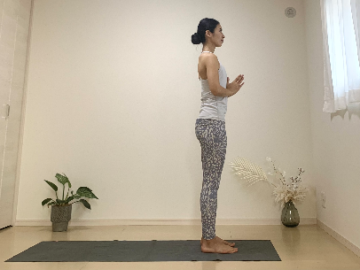 準備ポーズで首や肩をほぐしたら、太陽礼拝をスタート! 今回は、肩甲骨まわりの筋肉と太もも裏が柔らかくなるようにアレンジしています。結果的に、お尻を後ろに引きやすくなるので、自然と上半身の血流促進効果アップが期待できます。