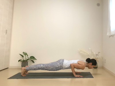 7. 息を吸って、吐きながら、両肘を曲げて上体を床に近づける。カラダを支えにくい場合は、両ひざを曲げて床に軽くついた状態で行ってもよい。