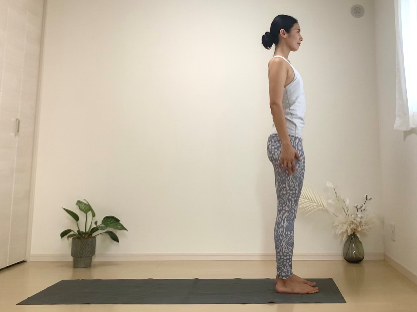 1. 両脚を揃え、マットの前側にまっすぐ立つ。両腕はカラダの脇に伸ばす。
