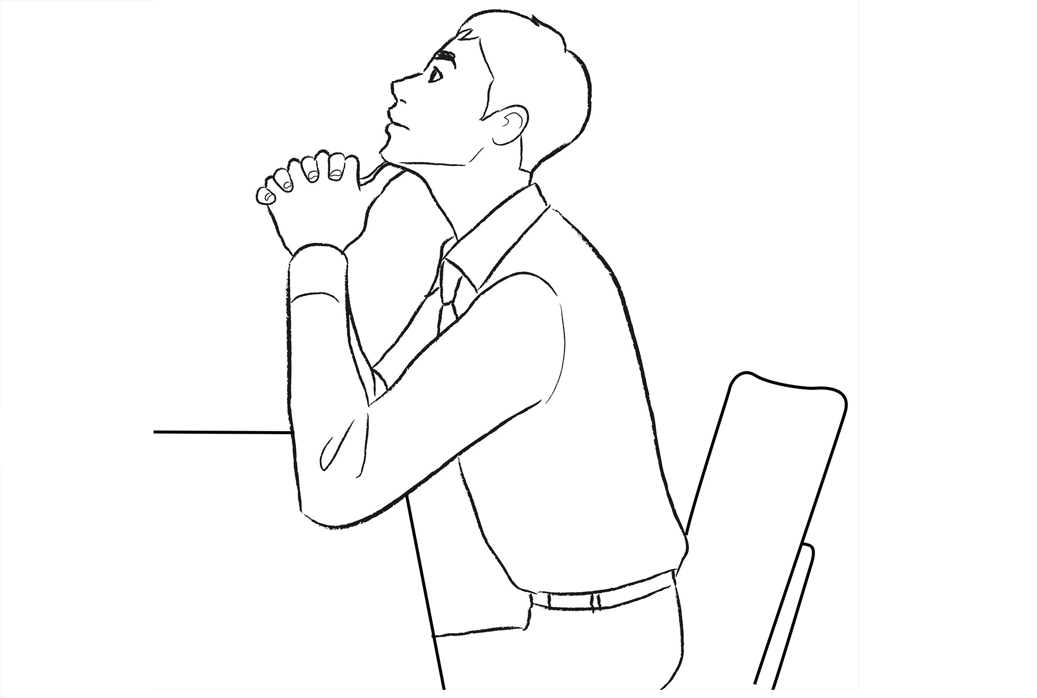 1. デスクに両肘をついて両手を組み、親指を揃えて立てます。