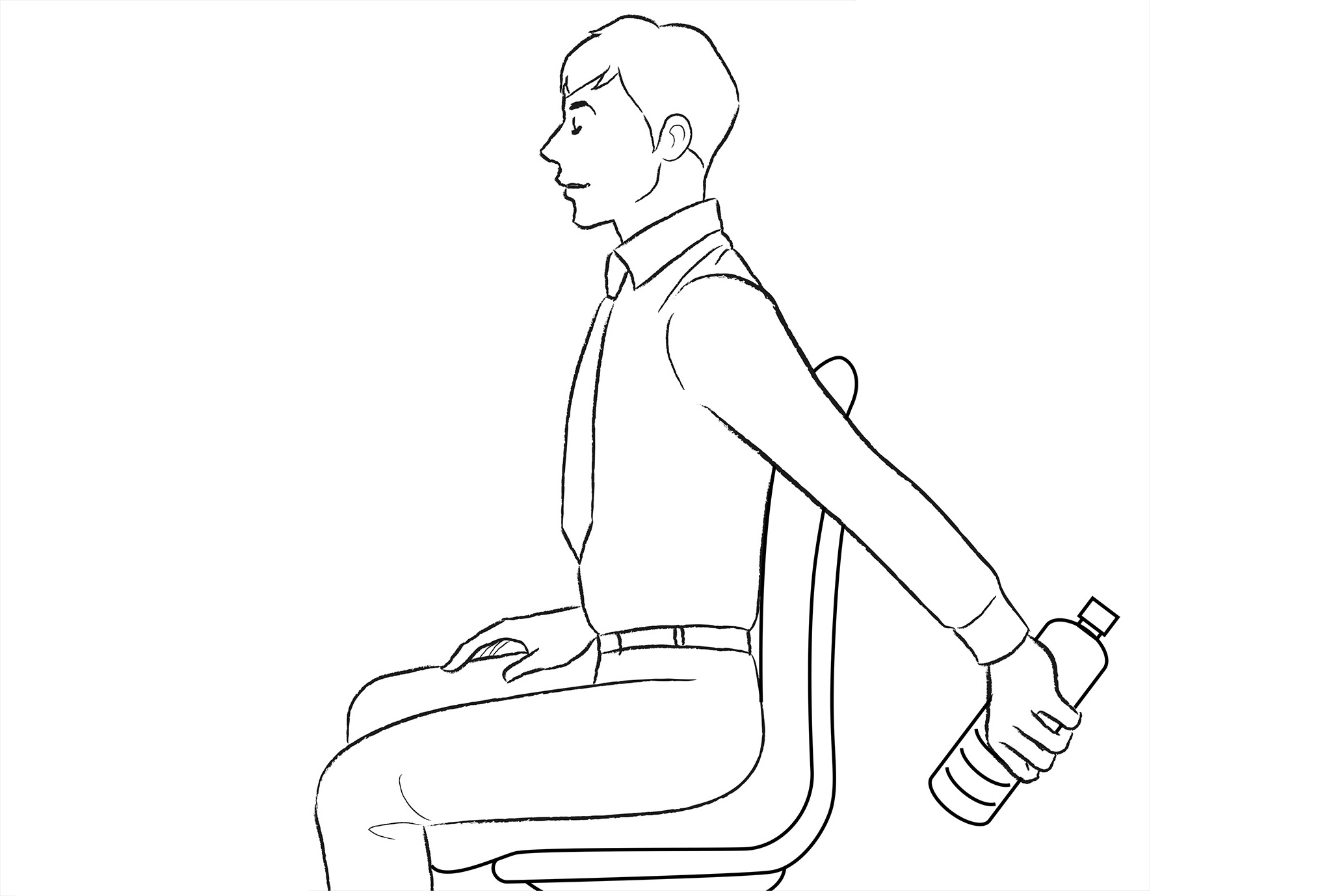 1. 椅子に座ったまま片手でペットボトルを握り、腕をまっすぐ下ろします。