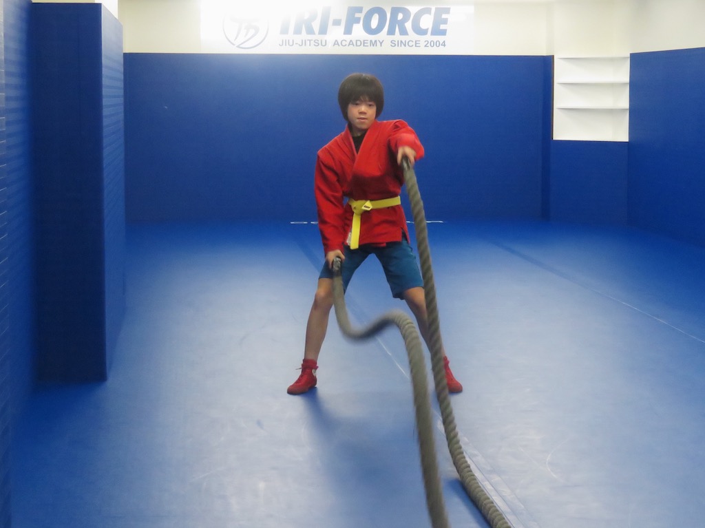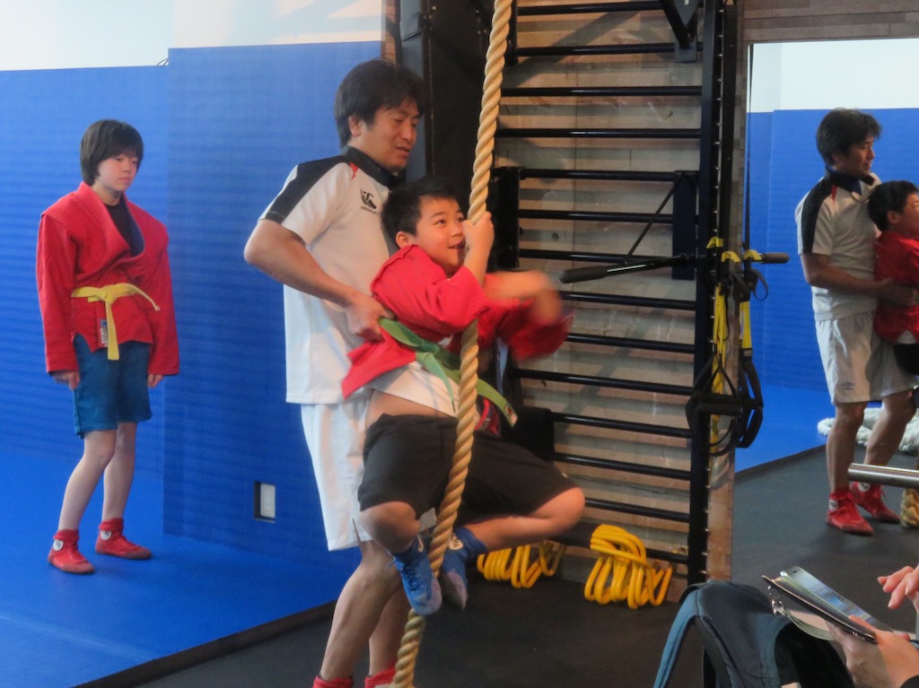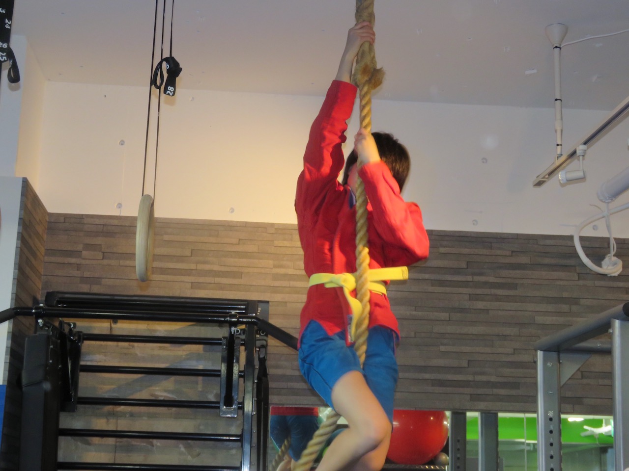 子どもたちは道着へ着替えると、まず天井からぶら下がったロープをよじ登って基礎体力を鍛えます。道場へ通って8年目になるという女の子(小学6年生)は簡単に登ってみせますが、まだ筋力が発達していない男の子(小学1年生)はロープにつかまってキープする練習です。