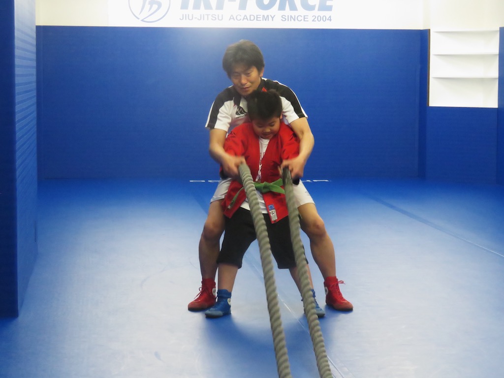 その後はチューブを使って投げ技の確認をし、実際に田中コーチが相手になってのスパーリングへと続きます。通常は子ども同士でも行いますが、この日の参加者は2人だけのため、特別に長い時間を割いてのマンツーマン指導が実施されました。