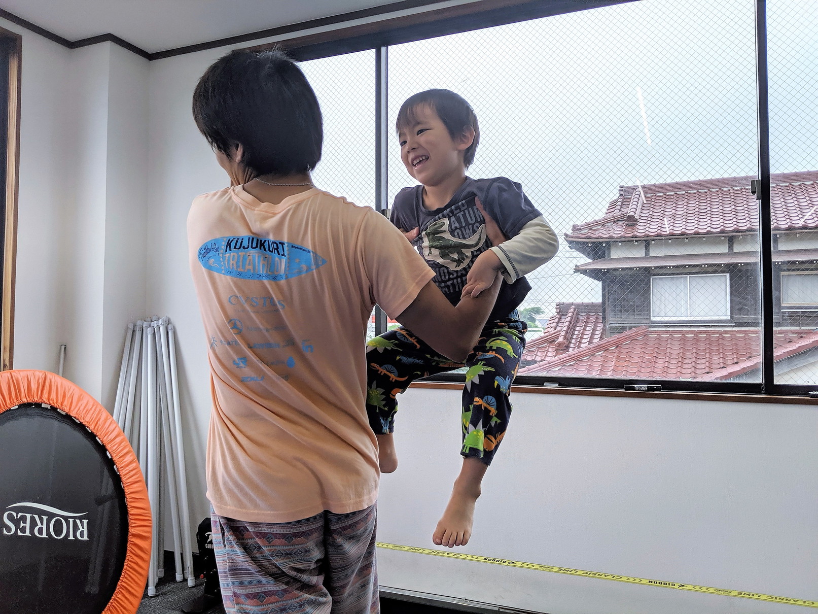 目の前に立った子どもの脇の下を持ち、そのまま持ち上げます。ゆっくり地面に戻したら、再び持ち上げる……の繰り返し。左右の足でしっかりバランスを保ちましょう。子どもの身体がスイングとともに動くため、まるでケトルベルを持っているかのような感覚でトレーニングできます。