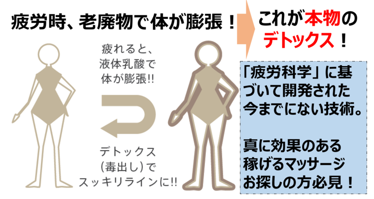 疲労科学で、人が疲れた時に起こっている明確な変化を、理論的に理解しその上でデトックスマッサージで体にどんな変化を起こし、その結果どんな状態になるのかわかりやすくご説明します。とにかく目からウロコがおちます。