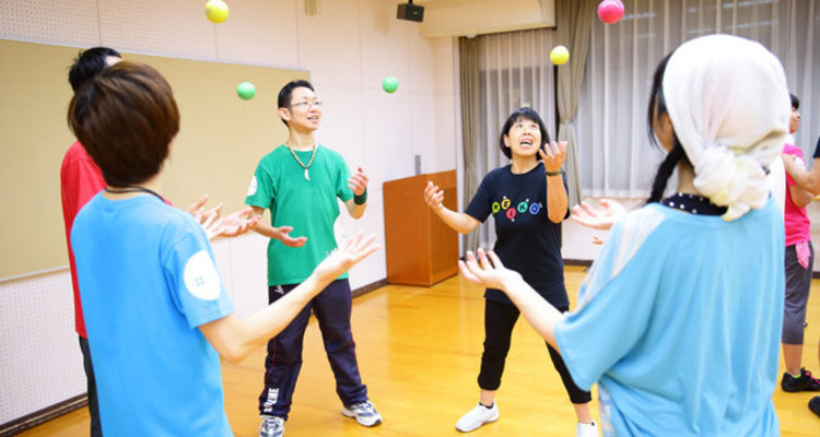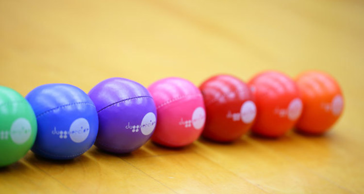 ジャグササイズで使う道具は、手のひらサイズのボールひとつだけ。それを投げたりキャッチしたりしながら、身体をひねったり、のばしたり、ステップしたりします。上手くこなせたら、また違った動きにチャレンジしていきます。 誰でもできる簡単な動きだからこそ面白く、それに遊びの要素も加わって、子どもからご年配の方まで、夢中になって楽しく続けられます。