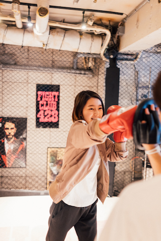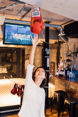 渋谷にあるスポーツクラブ「FIGHT CLUB 428」は、トレーニングができるだけでなく、併設された金網リングで催される試合を観戦したり、バーでお酒(もちろんプロテインもあり!)を飲んだりできる稀有な場所。しかも、ビジターでもスパーリングやミット打ちに挑戦できる。だから、遊びに来るカップルもけっこう多いんだって。