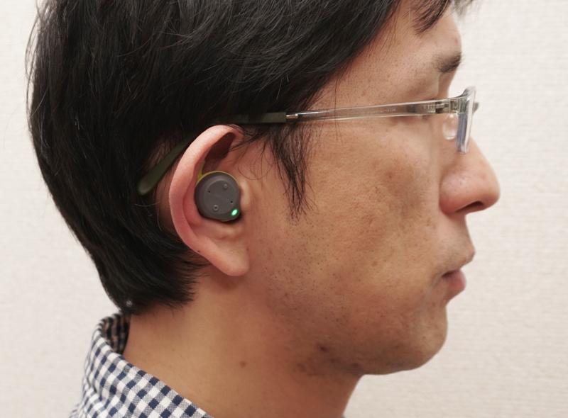 ▲完全ワイヤレスイヤホンを装着したところ。左右のイヤホンケーブルから解放される装着感と音楽体験には誰もが驚くはず