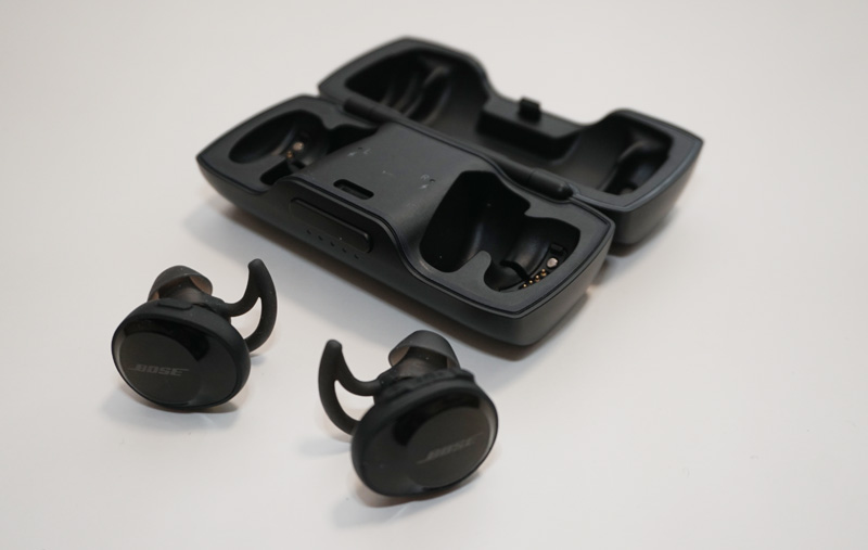 最初の製品はBOSE(ボーズ)の「SoundSport Free wireless headdphones」です。ブランド初の完全ワイヤレスイヤホンは耳のくぼみに引っかけるスタビライザーを一体化したイヤーチップ「StayHear+ Sport」が安定度の高い装着感を実現します。イヤホン単体でのバッテリー駆動持続が約5時間と長く、専用ケースに入れれば15時間の連続音楽再生が可能です。