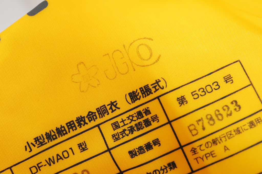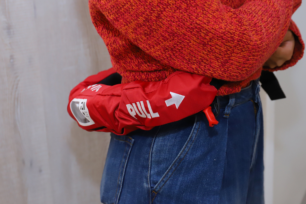 「今は軽くて着けやすい製品がいろいろあります。腰に巻いているだけでOKなものもありますよ」と晴山さん。下写真のライフジャケットは、水に落ちたら自動的な膨らむのだそうです。