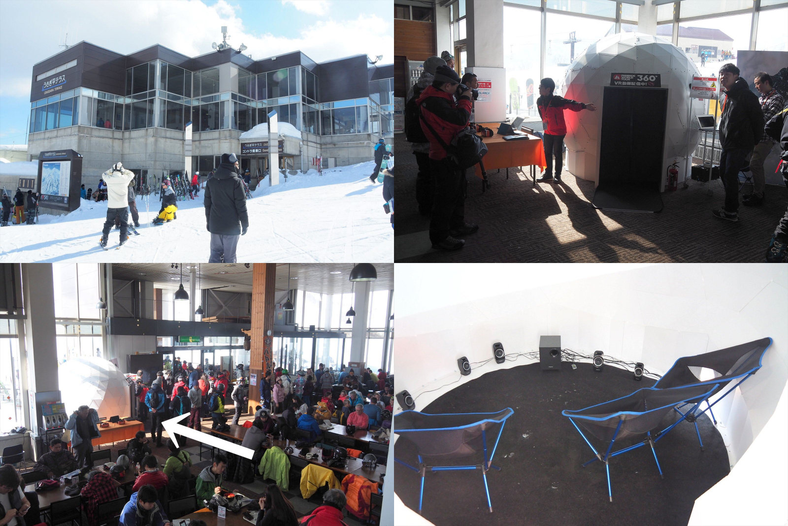 なお白馬八方尾根スキー場のうさぎ平テラスには、FWT出場選手が白馬八方尾根スキー場や白馬アルパインエリアで撮影した360度カメラの映像を使って、選手の滑走するスピードや迫力をVRで体感することができる「ドーム型VRスペース」が設置されていました。ヘッドマウントディスプレイを使わずに多人数でVRを楽しめるとあり、家族連れなどにも好評のようでした。
