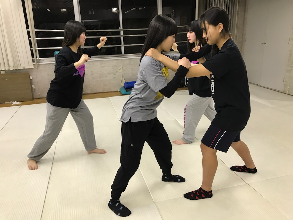 ヒナノ:まずは基礎体力を鍛えるために、開脚やスクワット、腕立てなどマット運動でウォーミングアップをしてから、ロープワークや二人ひと組で組み技のような実践式の練習をします。
