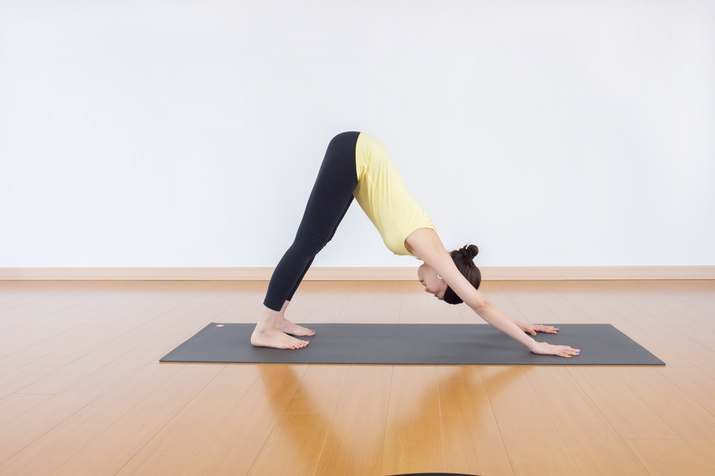 ▲ダウンドッグのポーズ。ふとももの引き締め、むくみ解消、バストアップやヒップアップ効果が期待できます