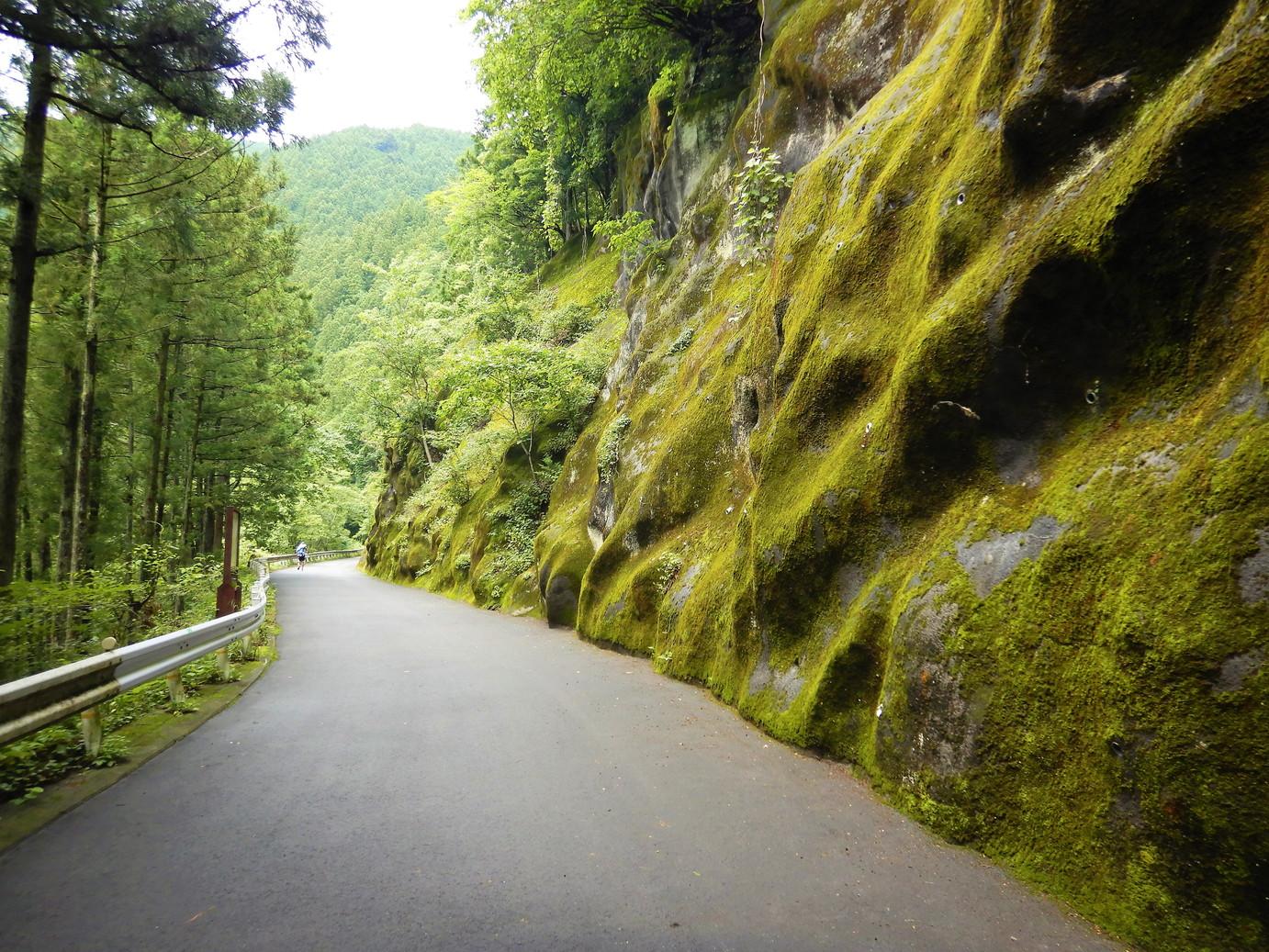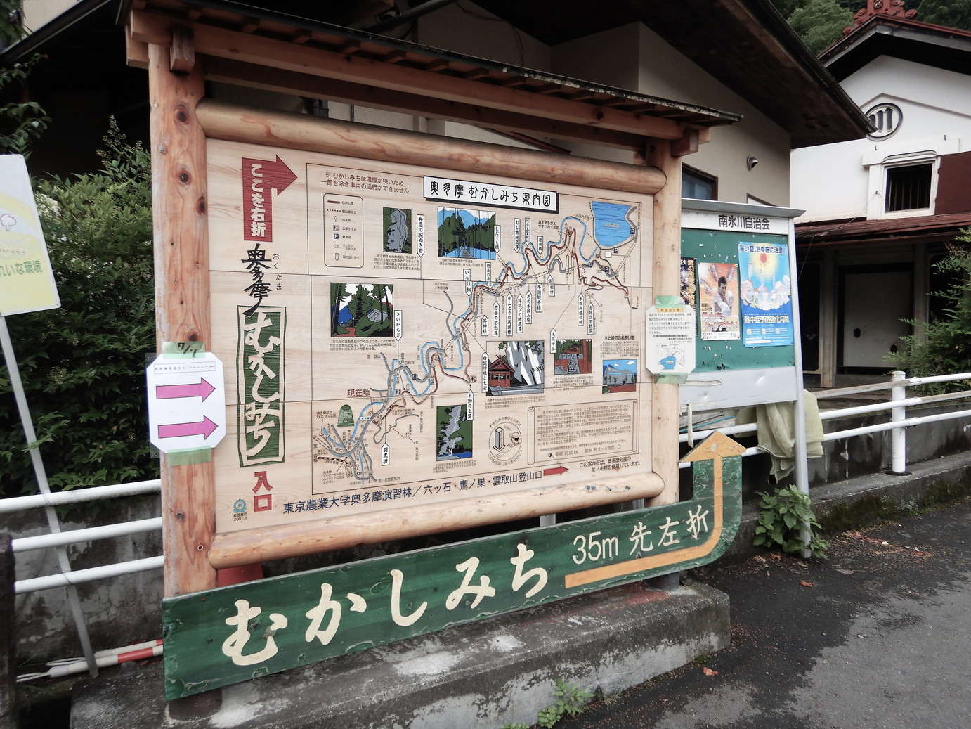 スタートから約35kmで到着する奥多摩駅周辺から、「むかしみち」という場所へ入っていきます。入口に置かれた地図を見てみると、滝や神社などいろいろなスポットが点在しているようです。各スポットについては後編で詳しくご紹介しますが、こちらもまた、ただロードを走るのとはひと味違うコースでした。