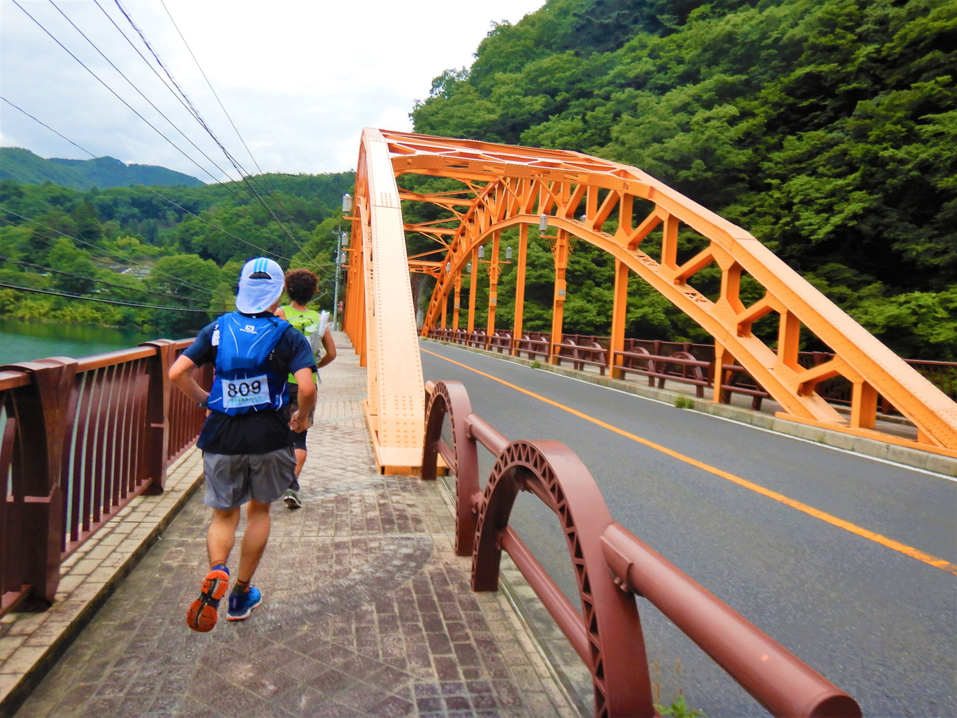 本大会ではいくつかトンネルを通ります。広い歩道はないため、車に注意しながら慎重に。車の音がするからと立ち止まったり振り返ったりすると、かえって危ないので気をつけましょう。いくつもの橋を渡り、気がつけば、さっき走っていた場所が湖の向こう側に。橋は赤やオレンジなど特徴的な色なので、「さっき通ったな」「あそこに向かうのかな」などと、いい目印になります。