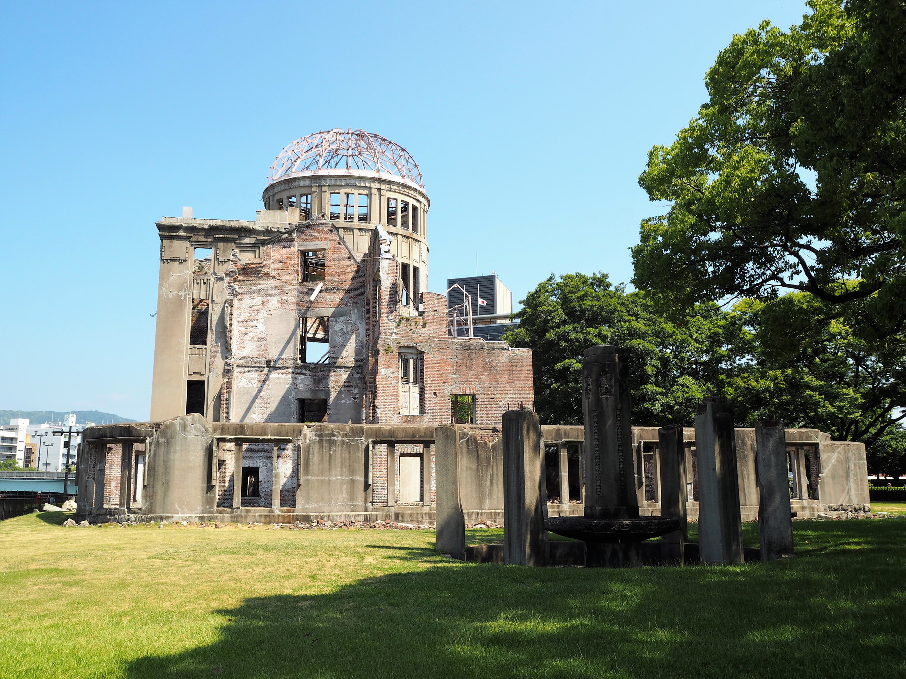 平和記念公園から元安川を挟んだ先に、「原爆ドーム」があります。やはり、ここもぜひ訪れておきたい場所。川越しに公園内からも見えますが、橋を渡ってすぐなので行ってみましょう。いかに原爆が凄まじい威力だったのかが、見るだけでよく分かります。