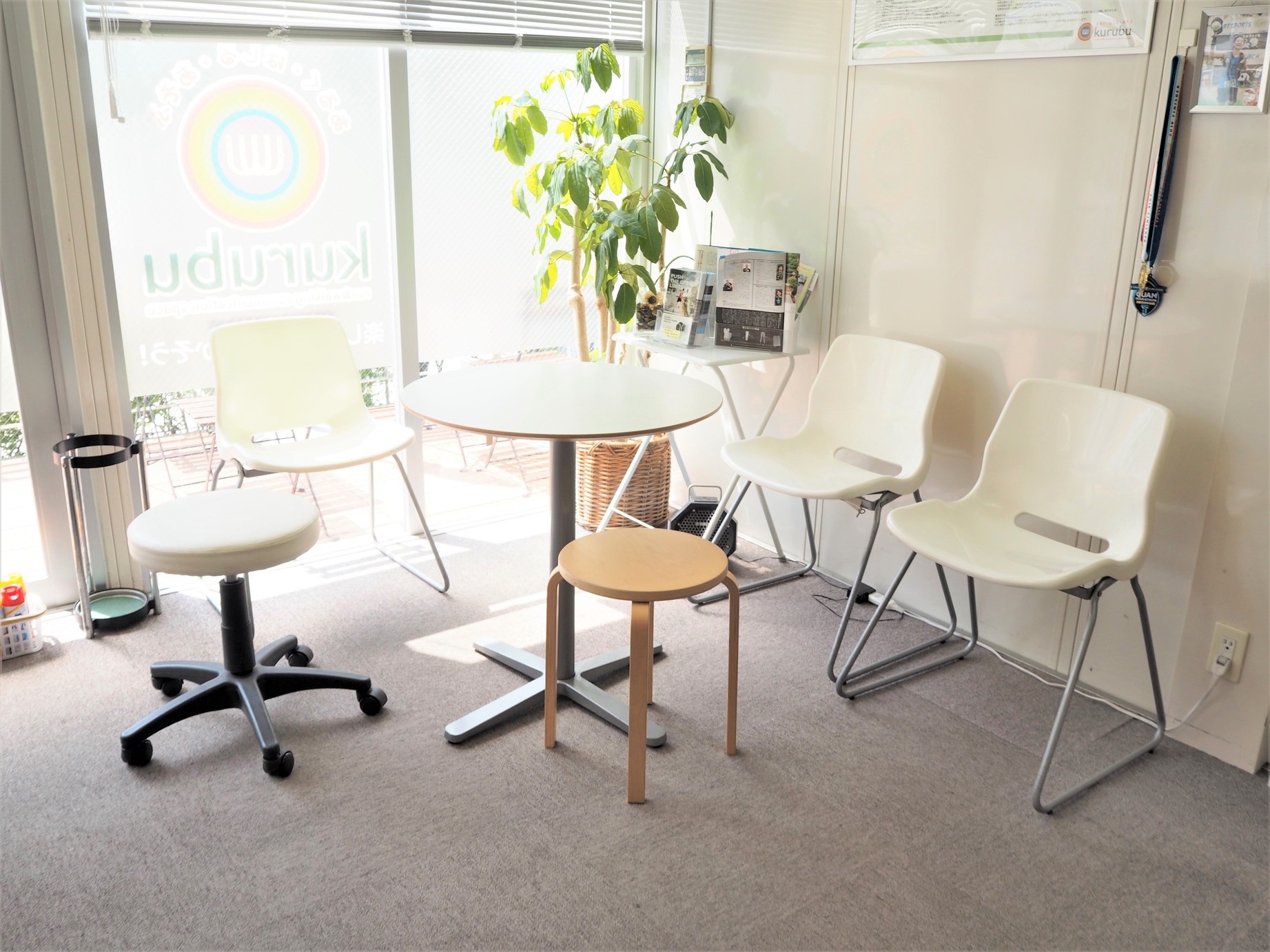 受付前にはイスと机があります。待ち合わせや休憩によいでしょう。窓から太陽光が入り、とても明るいスペースです。「Kurubu」を一通り見てみると、全体的に清潔感があって広々とした印象でした。