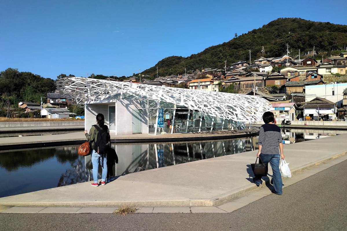 男木島は高松港からフェリーで約40km。港にある芸術的な建物は、待合所を兼ねた「男木交流館」です。瀬戸内では3年に1度「瀬戸内国際芸術祭」が開催されており、ここ男木島も開催地の1つ。そのため、島内には開催年以外でも、アーティスティックなスポットが点在しています。