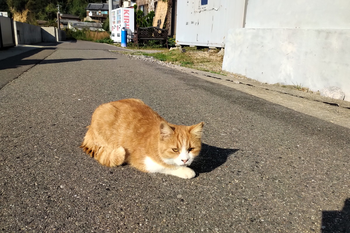 走る準備を整えて、ふと周りを見ると、道のど真ん中で休んでいる猫を発見! これは幸先のいいスタートです。きっと走っている間にも、たくさんの猫と出会えることでしょう。期待に胸を躍らせつつ、まずは男木島灯台を目指して走り始めます。