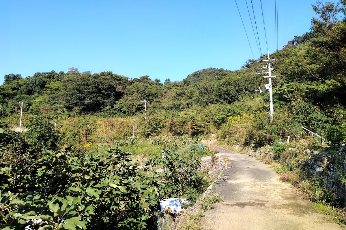 山道は、やがて最初に灯台へ向けて走った道と繋がります。あとは道を戻って港へ。ここまでは周辺に人が住んでいないため、猫には出会えませんでした。やはり、猫たちは集落にいるのでしょう。