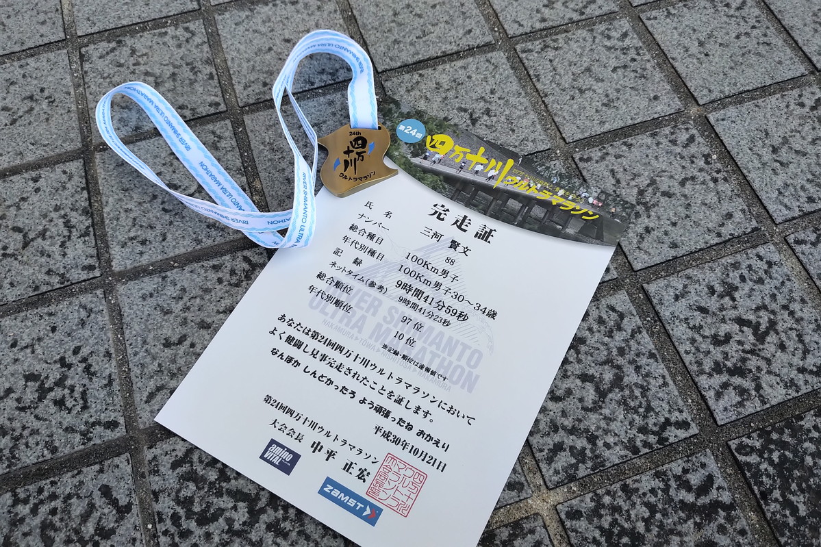 完走メダルとともに、完走証もすぐに発行してもらえます。自分の順位や記録が気になる方にとって、意外とうれしい対応です。今回が第24回目の開催ということですが、さすが手際のよい運営。スタートからゴールまで、安心して楽しむことができました。多少アップダウンは厳しいものの、初めてのウルトラマラソンとしてもオススメできる大会です。