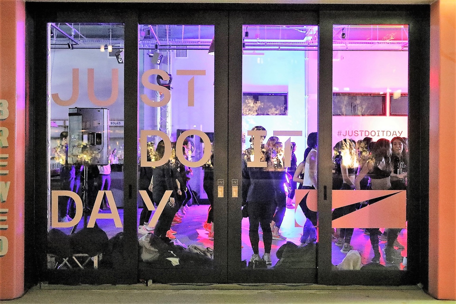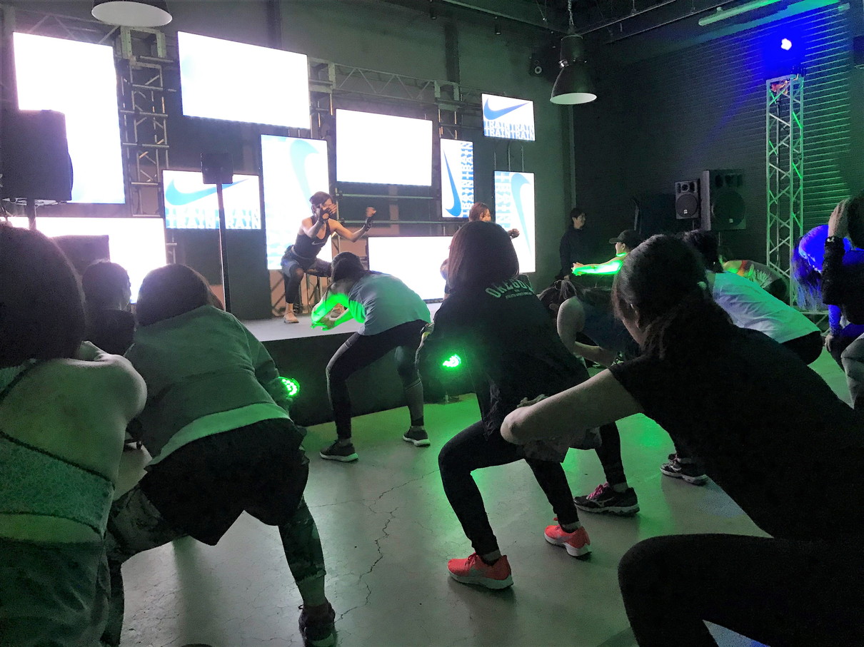 全グループが集まると、NIKEトレーナーの2人が登壇。キックボクシングのワークアウトが始まります。