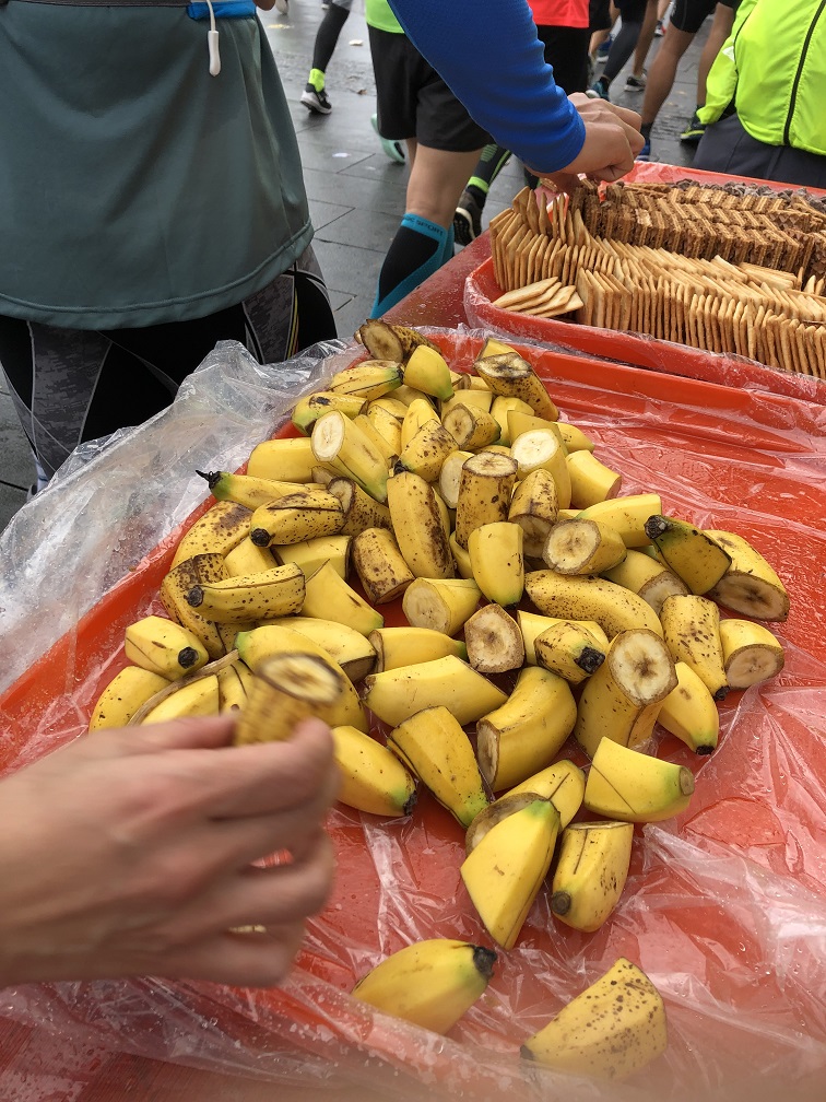 台北マラソン2018のエイドステーションは、合計15か所。水やスポーツドリンク、バナナや菓子類などで水分&栄養補給のチャンスは、ほぼ足りるであろう印象です。