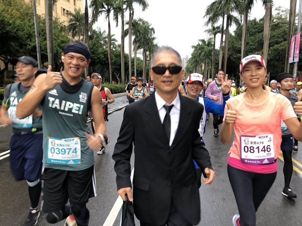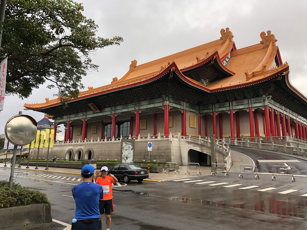 スタート地点の台北市政府から、最初の10キロまで、国分記念堂を通過し、台北の名所コースの入り口でもある景福門をぐるっと1周、中正記念堂を眺めながら、小南門を右折するという、風光明媚な観光スポットを次々に目にしながら通過しました。そして、エイドステーションでは、自分も他のランナーの皆さんと一緒に、水分やスポーツドリンクなどをこまめに摂取。そして、時には笑顔で、時には、お互いに「加油!」と励まし合いながら、地元のボランティアスタッフとの写真撮影や会話を楽しみました。