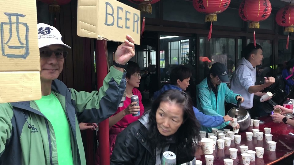 30キロ過ぎ。やっと、川沿いを終える頃かと、台北市内を目の前にしながら、足を進めていくと、なぜかランナー達でごった返しているエイドステーション? お店? いや、はたまたカウンターバーを発見!視界が定かでない目の周りを拭くと、でたぁ~!まさかまさかの、ビールステーションでした。