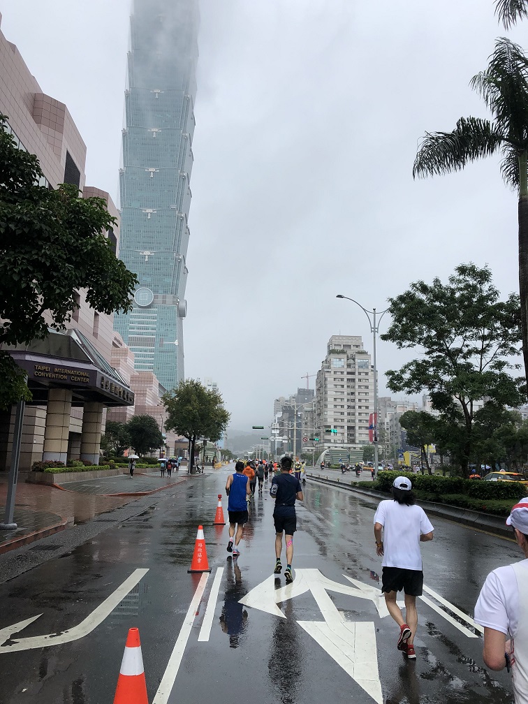 あっという間に残り5キロ。台北市内に戻ってくると、市街地を駆け抜け、基隆路の地下道をくぐり、残り1キロ。おっ、見えてきました! ゴール地点の目安であるそびえたつ建物、台北101。