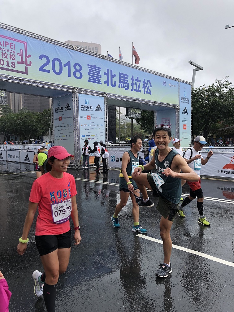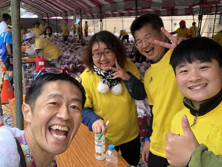 フルマラソンを走り終えた私は、レース後のブースで、完走シャツや、お弁当、バナナ、プロテインバーなどを賞味した後、ゴールゲートをバックにパチリ! すると、スタート前や、ランの途中でもお会いした、スーツを着て走るファンラングループに、ゴール後も遭遇。皆さんと、無事にゴールできた満面の笑みを浮かべてパチリ。台北の観光スポットを満喫し、一緒にゴールした異国のランナー仲間の笑顔で、身体と心のクールダウンを楽しみました。