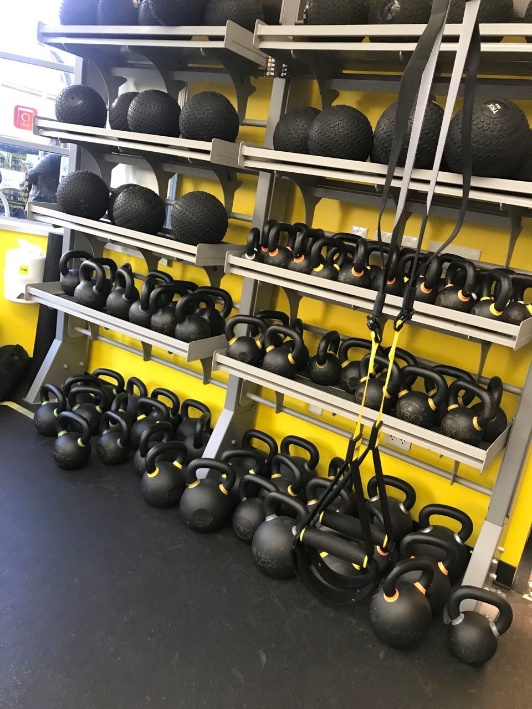 スタジオには、TRX以外にもダンベル、ケトルベル、メディスンボウルなどがあります。