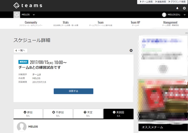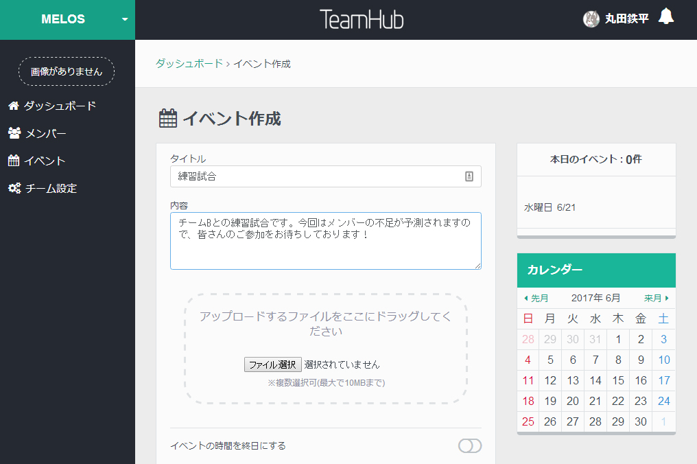 予定の登録内容は、これまで紹介したサービスの中で最も充実しています。ファイルのアップロードに対応しており、「場所」や「対戦相手」はあらかじめ登録しておいたものをプルダウンから簡単に設定。チームメンバーに予定を通知するかを、チェックボックスで選べるため、入力した内容を下書きして保存することもできます。
