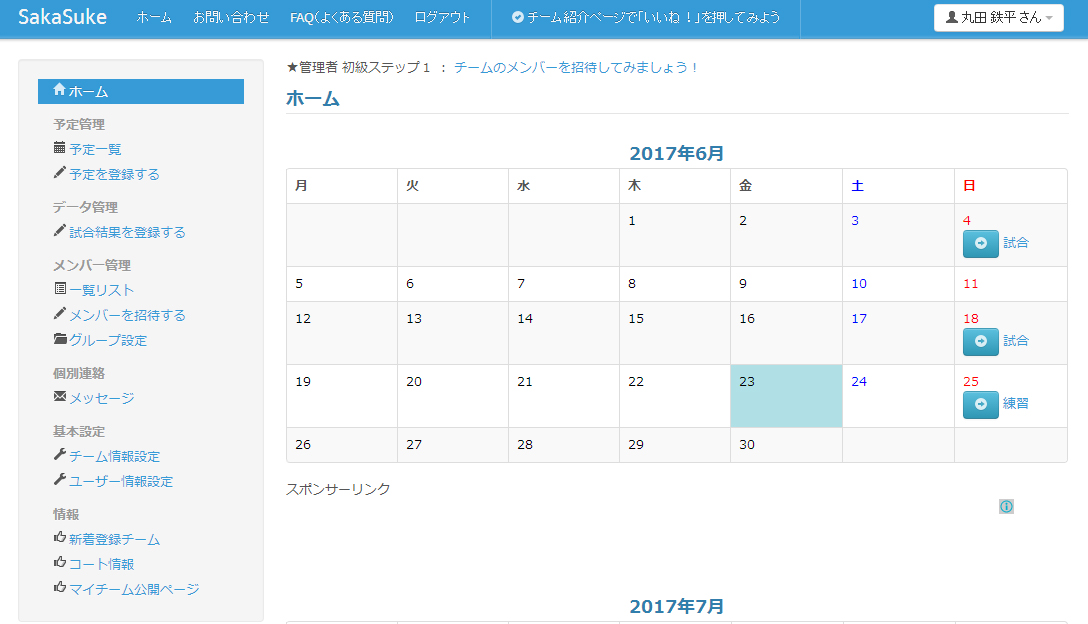 選手の管理を行うには、「メンバー招待」機能でメールを送ります。その後、メンバーとして登録されると、以降は練習や試合をスケジュールとして登録するごとに、招待メールが一斉配信されるという仕組みです。その際に回答期限を設定できるのは、幹事にはポイントが高いのではないでしょうか?