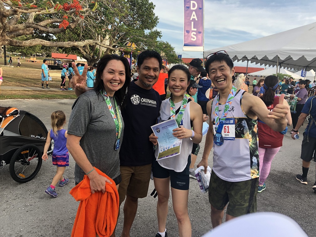 グアムでランニング・イベントに参加することは、現地のランニング仲間と会える、プチ同窓会の機会でもあります。ユウさんに、レース後のイベントエリアを回っていると、グアムランニングクラブ代表のマニーさんご夫妻にお会いし、「Congratulations! Great job!」と声を掛けられ、今回の“弾丸ラン”のプランを説明すると、「グアムに来たばかりで走ったの! クレイジーだけど、Youの笑顔は最高だよ!」と、ユウさんをハグして褒めて下さいました。