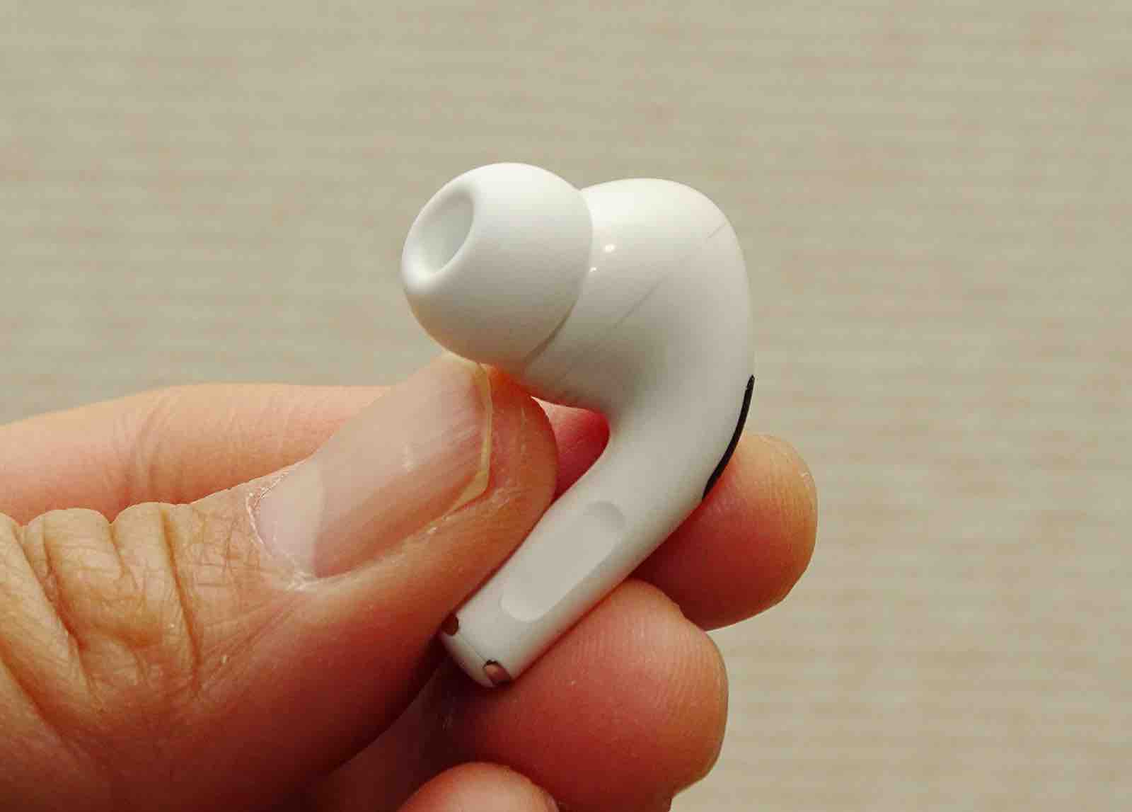 ふだん電車やバスに乗って音楽を聴く時にはANC機能を活用して、スポーツシーンでは外部音取り込みを使い分けるスタイルが賢いAirPods Proユーザーの心得と言えます。AirPods Proは本体のステムを指でつまむように握ると、内蔵されている感圧センサーが反応するリモコンを搭載しています。ANCと外部音取り込みの切り換えもリモコンからスムーズに行えるので便利です。