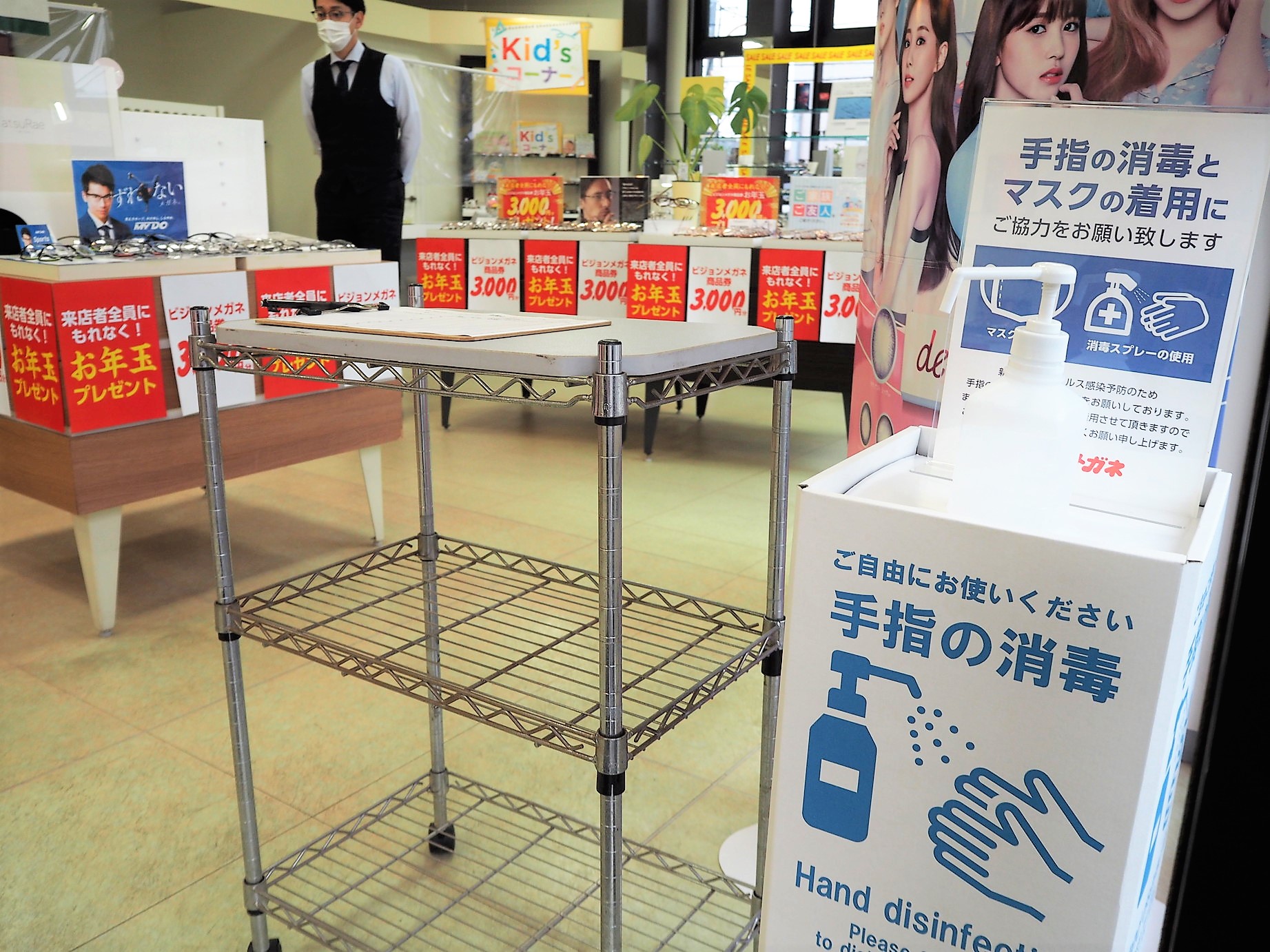 入口には消毒液が要されており、入店時には必ず手を消毒するよう促されます。加えて、店舗スタッフもマスクを着用していました。もちろん、私もマスク着用です。消毒を終えると、スタッフの方に視力を計測するブースへと案内されました。