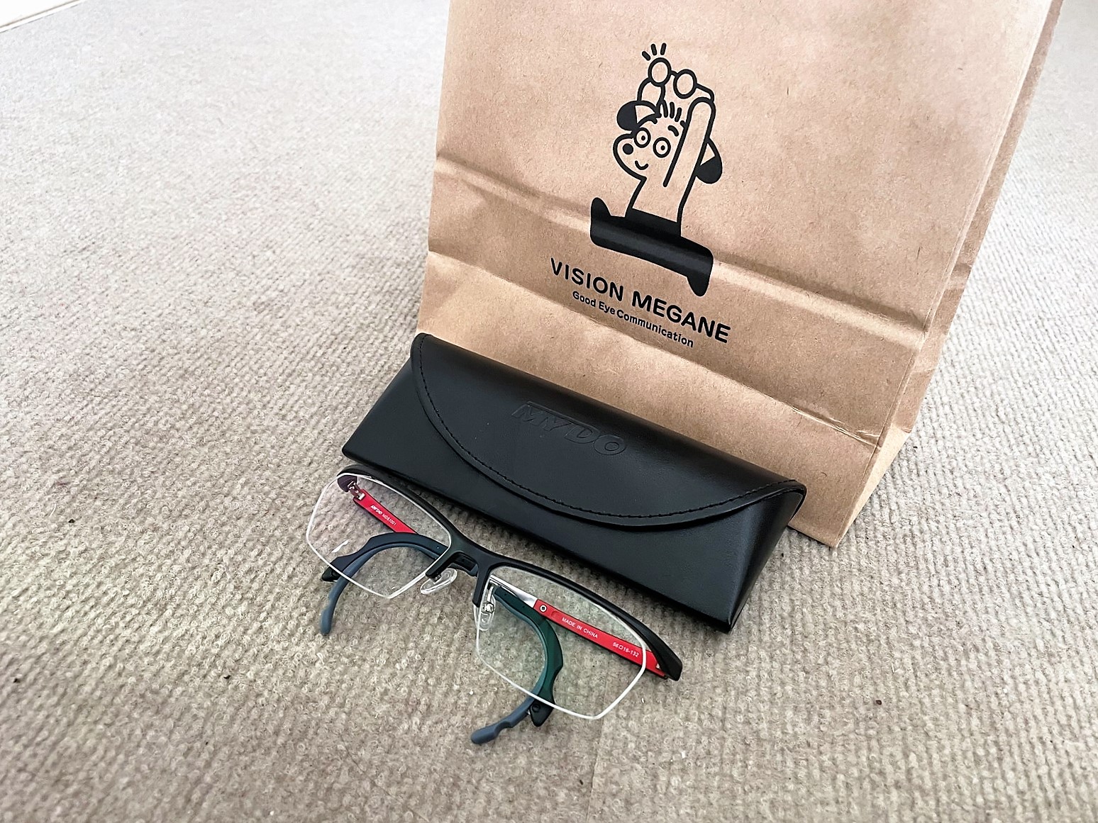 こうして作っていただいたのが、こちら。レンズ下半分にフチのないハーフリムタイプの、レッドカラーを選びました。付属のメガネケースも高級感があり、かっこいい印象です。