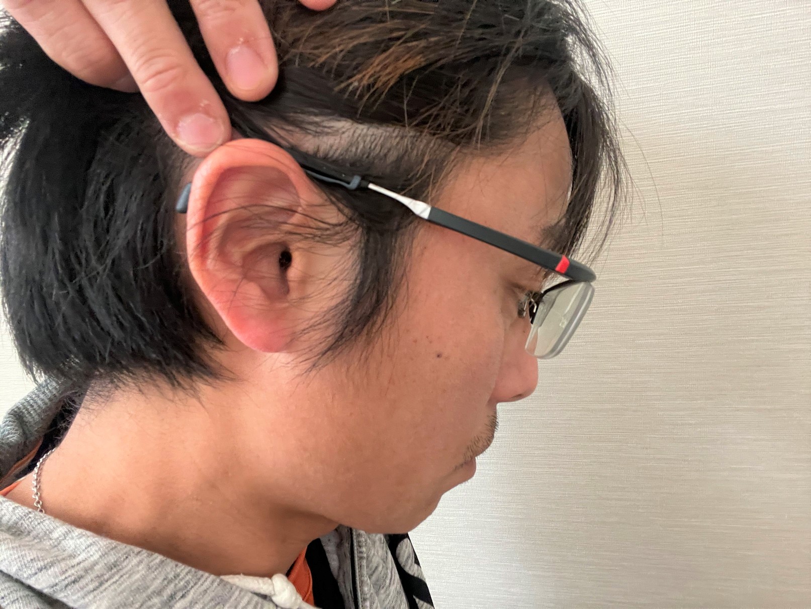 「MYDO」はフレームの耳にかける先セル部分に、耳の後ろまでぐるりと巻きついて固定する特殊構造のパーツを採用しています。これが“ズレない”理由となっており、メガネバンドを使わなくても耳に吸いつくようしっかりフィットするとのこと。