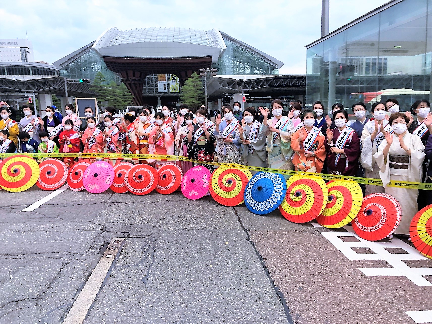 金沢駅前には華やかな「小粋なきもの倶楽部」の皆さんがエール!