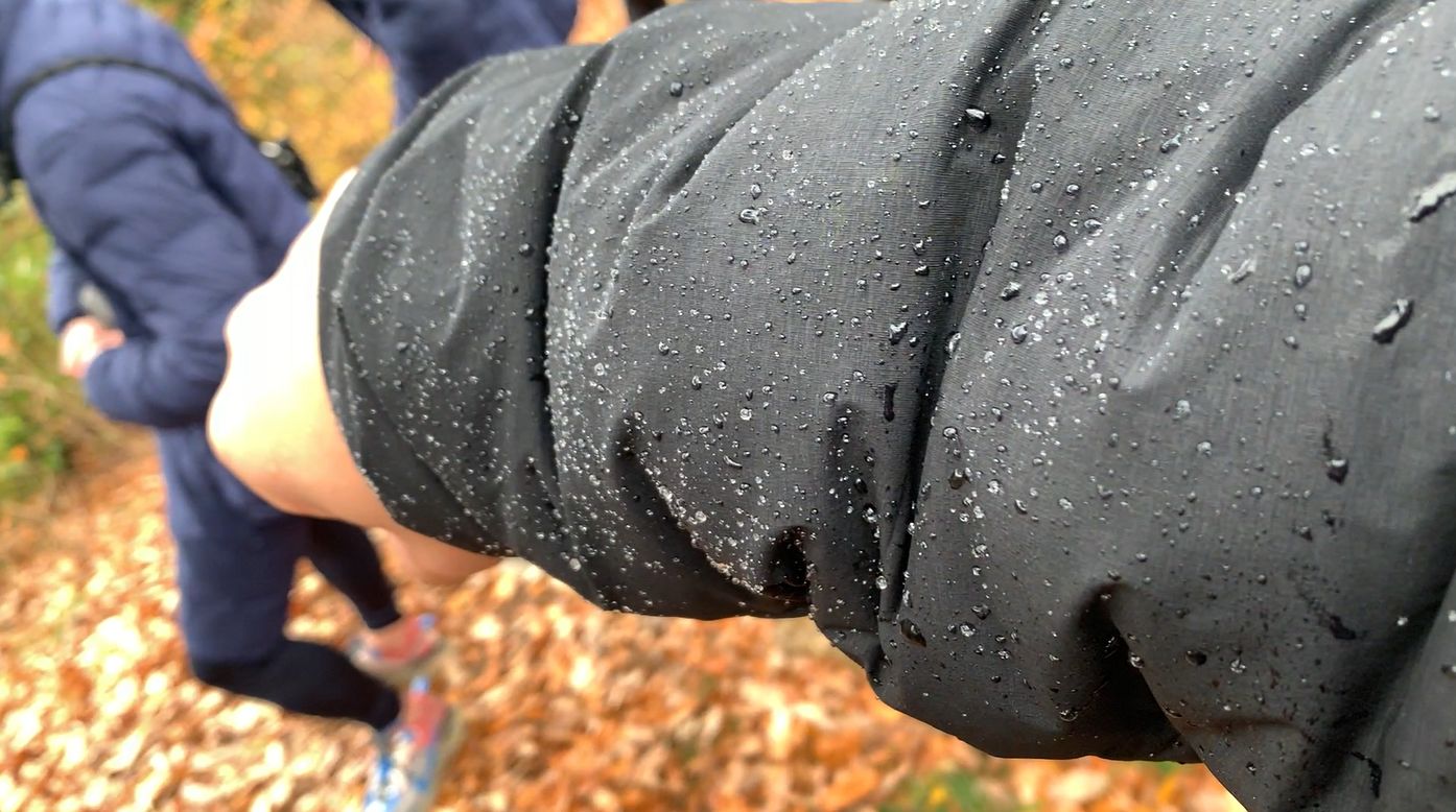 ▲小雨が降っていましたが、耐久撥水加工が施されているのか、水を弾きます。