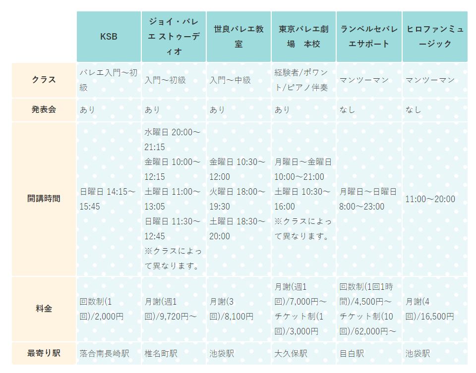 新宿・目白・池袋周辺のバレエ教室 比較一覧表