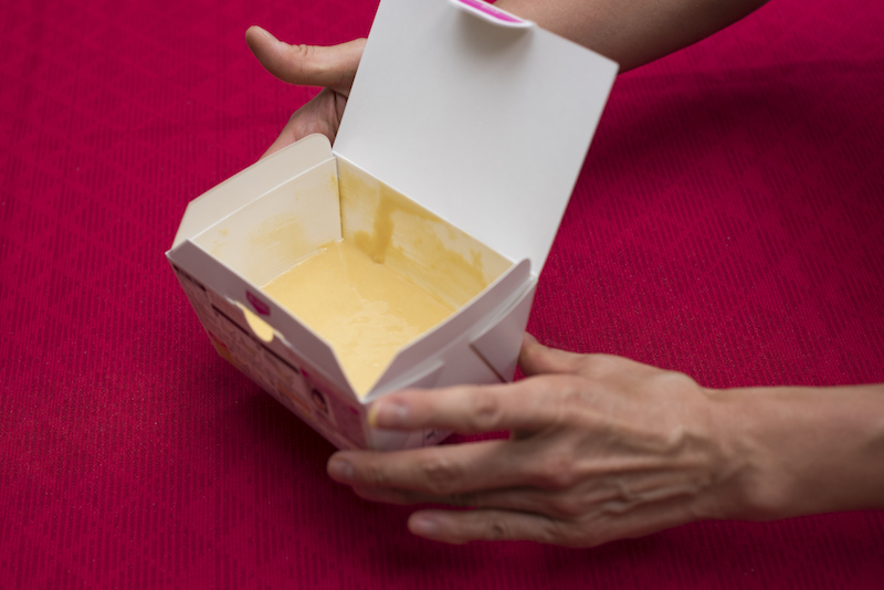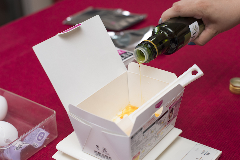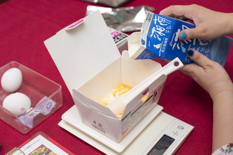 作る工程は、至ってシンプル!まずはキットを開けて、内包された大豆プロテインスイーツ粉の袋を取り出したら、箱の中に卵を割り入れて溶きます。