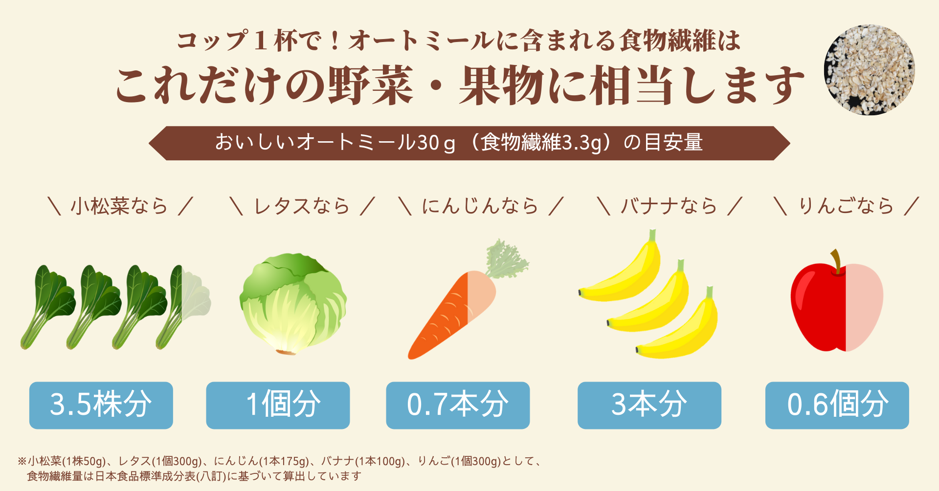 ちなみに、同社も「おいしいオートミール」という商品をリリースしていて、同商品なら1食30グラムで1日に必要な7種のビタミン(ビタミンB1、ビタミンB6、ビタミンB12、ビタミンC、ビタミンD、葉酸、パントテン酸)の三分の一が摂取できます。